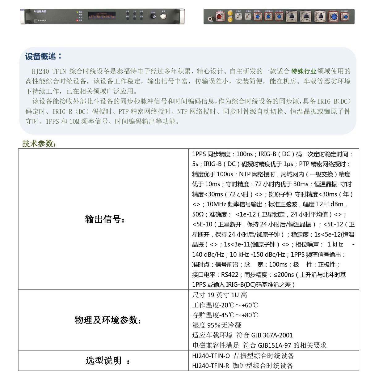 HJ240-TFIN 综合时统设备是泰福特电子经过多年积累,精心设计、自主研发的一款适合特殊行业领域使用的高性能综合时统设备,该设备工作稳定,输出信号丰富,传输误差小,安装简便,能在机房、车载等恶劣环境下持续工作,已在相关领域广泛应用...